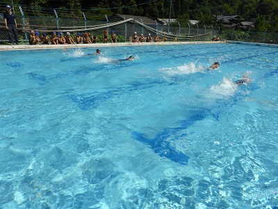 台風接近のため、予定を早めて、水泳大会を開きました。