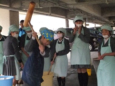 総合的な学習の時間に育てた餅米で餅つきをしました。保護者の方々に朝早くから来ていただき準備をしていただきました。餅のつきかた、まるめかたのこつを教えてもらいました。25kgの餅米をつきました。楽しくできました。