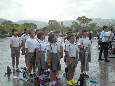 9月7日(木)、8日(金)の二日間は、修学旅行でした。7日(木)は、長崎市内で平和学習をしました。平和祈念公園で雨の中、平和集会を行いました。子どもたちが平和の尊さを感じながら平和の誓いを行って平和祈念像の頭の上で一羽の鳩が羽を休めて、子どもたちの方を見ていてくれました。語り部さんが「とてもめずらしいことです」と話してくださいました。