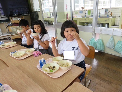 19日食育の日の献立は、しょうがご飯・豚汁・さんまの塩焼き・かぼす・なし・牛乳でした。