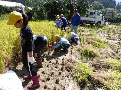 雨天のため二度延期になりましたが、10/25快晴の中、稲刈りをしました。田をお貸しいただいた地域の方(橋本様)に、田植えから稲刈りまで丁寧にご指導していただいたおかげで、無事に収穫することができました。