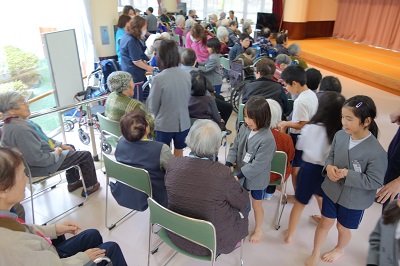 11月17日、ひかわの里交流に行きました。歌を歌ったり合奏をしたりダンスを踊ったりして見ていただきました。手作りのメダルを一人一人に渡すと、喜んでいただきました。