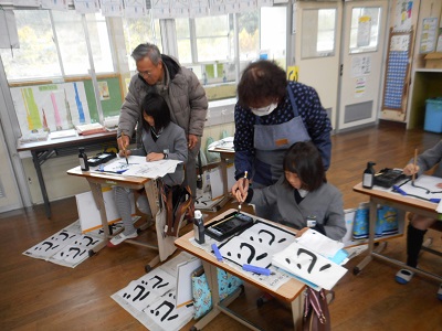 12月11日。3年生は、毛筆の学習で「美しい心」を小型条幅紙に書きました。地域のゲストティーチャー太江田さん、奥村さんに分かりやすく教えていただいたので、初めてでもがんばって書いていました。