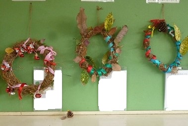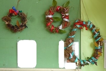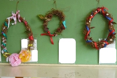 生活科の時間、朝顔やふうせんかずらのつるでリースを作りました。飾りになりそうな緑の葉っぱや実など準備し、みんな喜んで飾りつけをしました。すてきなリースができました。