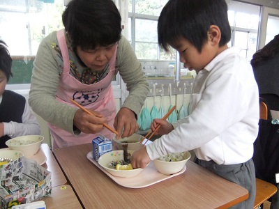 1、2年生は4時間目に、ヤマメクイズをして、やまめの事を勉強したあと、ヘルスメイトさんからやまめの食べ方を教えていただきました。