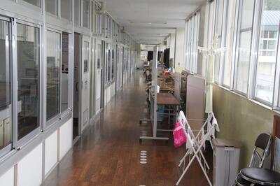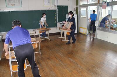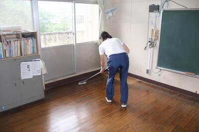 教室の机や椅子を廊下に出して、教室の床にワックスを塗りました。次に、廊下に出したものを教室に入れて、廊下の床にワックスを塗りました。