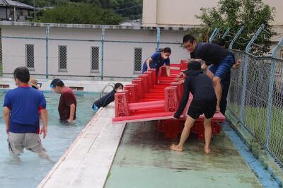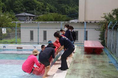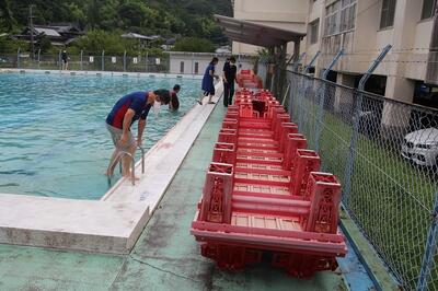 水の中からプールフロアを引き上げるときがものすごく重く感じました。全部で26台ありました。設置するのは業者の方にお願いしますが、上げるのは先生たちです。子どもたちがいない学校では、こんな光景があります。
