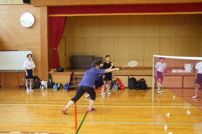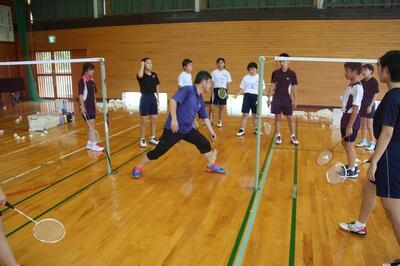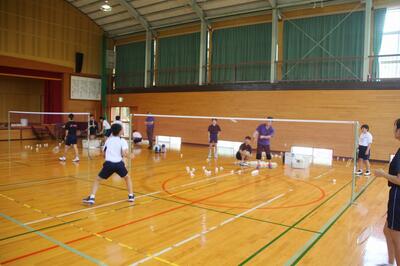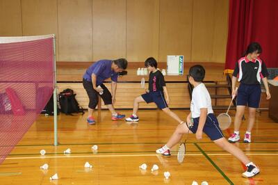 夏休み期間中、中学校の体育館が工事のため使用できないので、本校の体育館で部活動の練習を行っています。本校職員の中にバドミントンクラブで指導をしている専門家がいて、中学校から依頼があり、この取組が実現しました。動きのコツや練習のポイントなど専門的な視点からアドバイスを受けた生徒たちの動きが変容していきました。今後はスケジュールの都合がついた場合、この取組を行う予定です。小中連携が一歩前進しました。