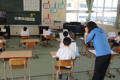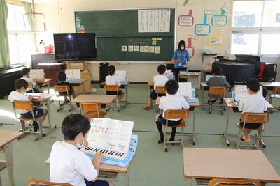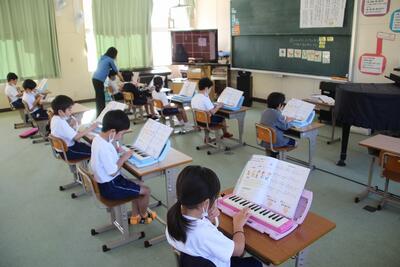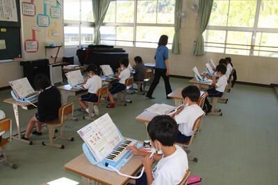 音楽科では、「山のポルカ」の合奏のために、鍵盤ハーモニカを練習していました。八分音符のリズムに合わせて、指を一生懸命動かしていました。図工の作品とつながっていますね。