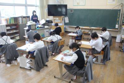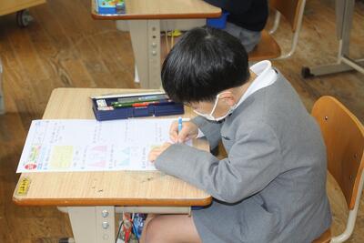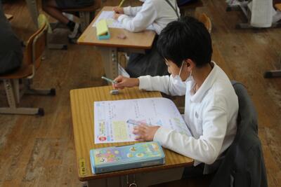 算数科では「三角形と四角形」という単元の学習が終わりました。ひとつの単元が終わると、だいたいテストが行われます。この日のテストでは、三角形や四角形のこと、辺や頂点、直角・正方形や長方形などの問いがありました。問題をよく読んで答えていました。