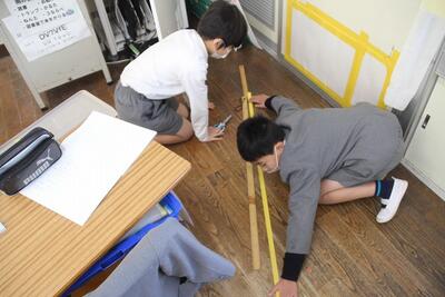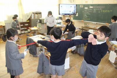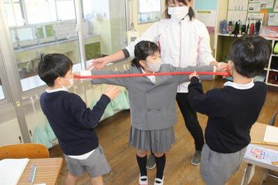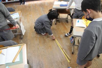 算数科では、100㎝をこえる長さの学習に入りました。この日は、両手を広げた長さを紙テープにとり、100㎝をこえる長さの測り方を考えていました。これから新しい長さの単位やその量感について学習していきます。