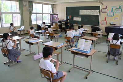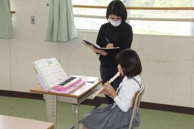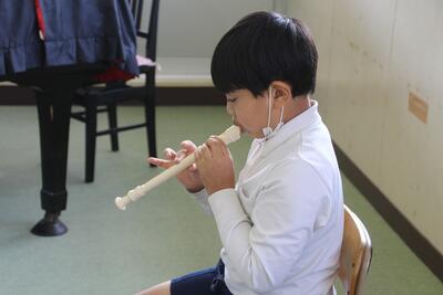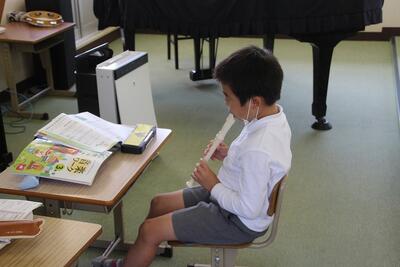 音楽科では「ゆかいな木きん」という曲で鍵盤ハーモニカやリコーダーの学習をしています。この日はリコーダーのテストでした。3年生になって吹き始めたリコーダーですが、リコーダー特有の指使いにだんだん慣れてきました。リコーダーの穴を指のはらで一生懸命押さえていました。がんばれ、3年生。