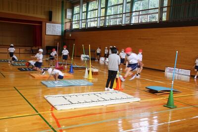 体育科でははば跳び運動を学習しています。助走・踏切・空中姿勢・着地などの動きを考えながら活動しています。この日は、高く跳ぶためにゴム紐や段ボールを置いて跳びました。みんなでロングジャンプを研究しています。