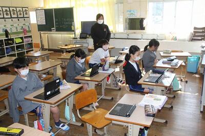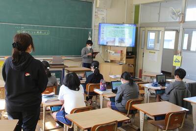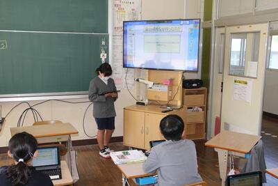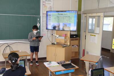 社会科では、熊本県内の文化財について発表しました。タブレットを使ってまとめた資料を画面で共有してペーパーレスで説明していきました。ホームページ担当者は紙があった方がいいなあと思うのは、時代の波に乗り遅れているのかもしれません。