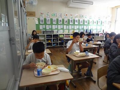 先日、6年生がしょうがの収穫を行ったことをお伝えしましたが、そのしょうがを使った給食がありました。教室に入ると新しょうがの香りに包まれていました。6年生がしょうがご飯(しょうがの入ったまぜご飯)をおいしそうに食べていました。東陽町だから味わえる貴重な給食メニューです。