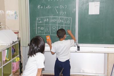 算数科では、身のまわりの数量について表やグラフを用いた分類・整理の仕方や、統計的に問題解決する基礎を学習しています。この日は、図書の種類を分類整理して、簡単な表やグラフにまとめました。漏れがないように数える方法を考えていました。