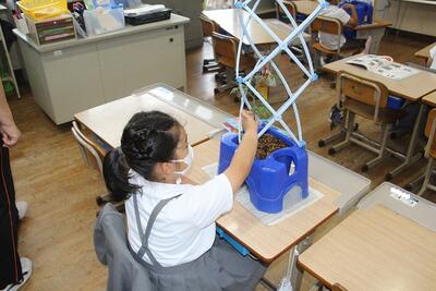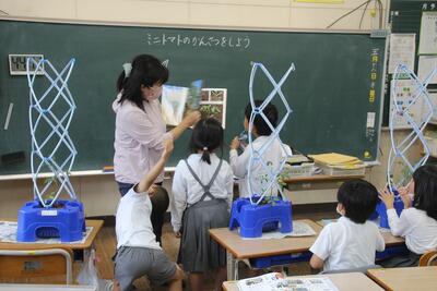 生活科では、ミニトマトの苗を自分の鉢に植えて観察をしました。色や形・さわった感じ・においなどを学習シートにまとめました。葉のにおいをかいで、「ミニトマトのにおいがする」とつぶやいていた2年生です。