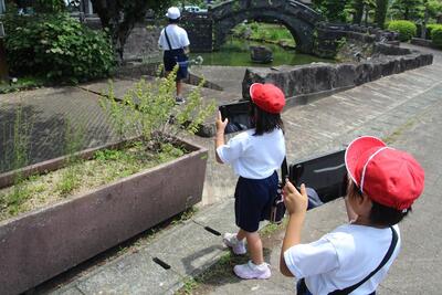 生活科では、初夏の町たんけんを行いました。初夏の植物や生き物・まちの人たちなどについて自分なりに発見したことをタブレットで撮影しました。これを学校に持ち帰り、たんけんマップにまとめていきます。