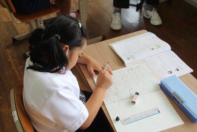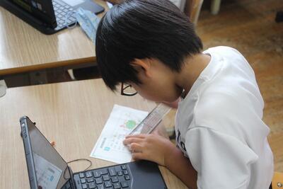 算数科では、長さの学習をしています。長さ比べでは、一円玉やマッチ棒などで数値化して調べました。そこから、長さの単位の必要性を理解しました。この日は、ものさしのしくみや使い方を理解し、実際に身の回りの物の長さを測っていました。