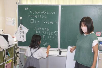 算数科では、1学期に学習したたし算とひき算の文章問題の復習をしました。タブレットの中にある学習シートに式や答えを書き込みました。学習リーダーを中心に答え合わせを行いました。たし算やひき算を表す言葉を根拠に、たし算なのかひき算なのかを結論づけていきました。