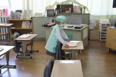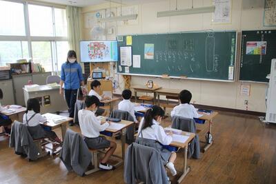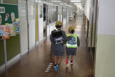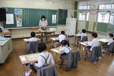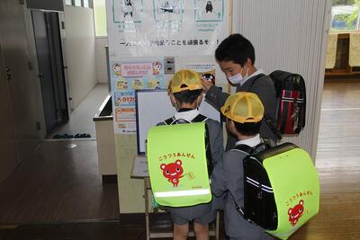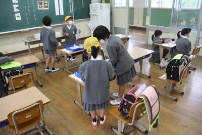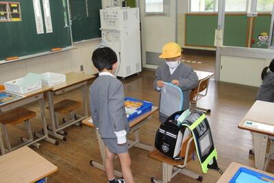 1年生の学校生活がスタートしました。登校班で上級生と一緒に登校しました。靴箱や傘立てに自分のものを収納して、消毒と検温をしました。やり方がよく分からなくて戸惑っているときは、上級生がやさしく教えていました。教室に入り、ランドセルから教科書や筆箱を取り出し、机の引き出しの中に移すときも、上級生が手伝っていました。道徳の学習では、みんながなかよくなれるためにどうすればよいか一生懸命考えていました。初めて体験することばかりですが、1年生はそれを楽しんでいるように見えました。1年生の皆さん、よくがんばりました。