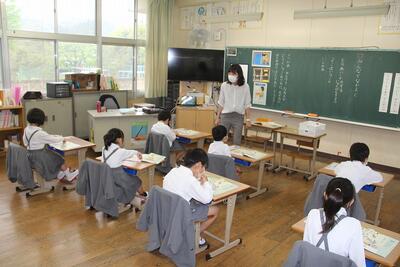 引き出しの中に移すのを手伝う3年生と1年生 |