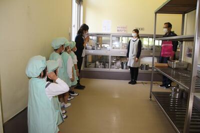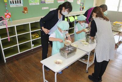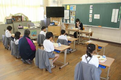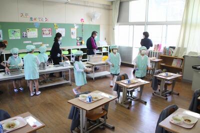 1年生は初めての学校給食でした。手を洗いエプロンを着て、校舎すぐ隣にある東陽給食センターに行きました。あいさつをして食器や食缶などを受け取り、教室まで運びました。教室ではおぼんや箸を配ったりご飯やおかずの配膳をしました。みんなで協力して準備ができました。1年生の初めての学校給食をお祝いして、そのメニューに赤飯が入っていました。1年生の笑顔があふれていました。