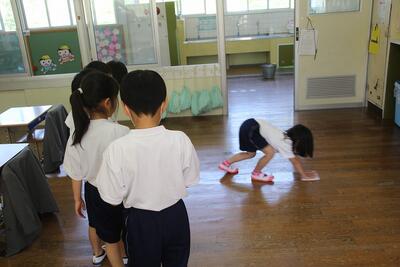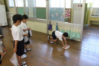 学活では、掃除の仕方を学習しました。ぞうきんをバケツの水につけてしぼることから始めました。その後、床をぞうきんがけしました。拭き残しがないように、前の人が拭いた後を見ながら、板目に沿ってまっすぐ拭きました。できることが一つ一つ増えていく1年生です。