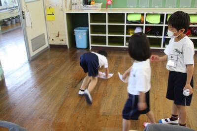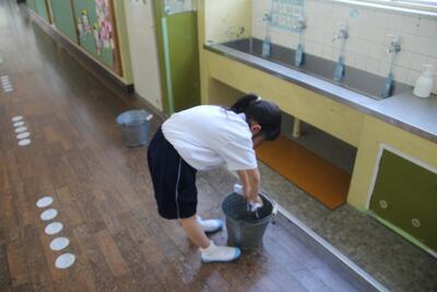 学活では、掃除の仕方を学習しました。ぞうきんをバケツの水につけてしぼることから始めました。その後、床をぞうきんがけしました。拭き残しがないように、前の人が拭いた後を見ながら、板目に沿ってまっすぐ拭きました。できることが一つ一つ増えていく1年生です。