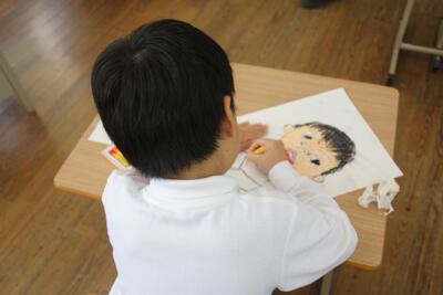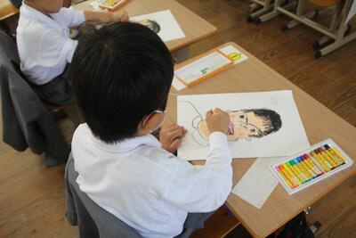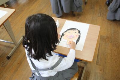 図工科では自分の顔を描きました。クレパスを使って、目や鼻・口などを描いて、輪郭・耳・髪の毛などを加えていきました。自分の顔の特徴を捉えていて、どの作品もすてきな自分の顔に表していました。1年生の皆さん、とても上手です。