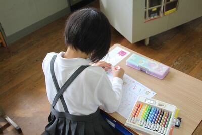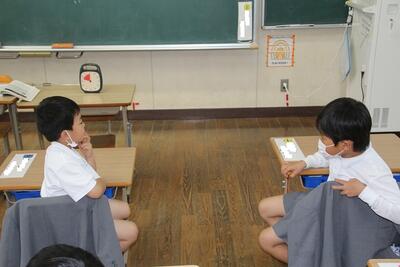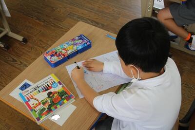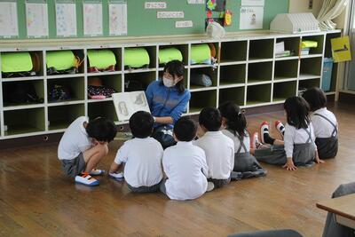 国語科では、ひらがなの学習に入りました。この日は「い」の練習をしました。1マスを4つに分割したプリントに、形を整えて書きました。書き終わるとイラストに色を付けていきました。その後、絵本の読み聞かせを行いました。文字や言葉に慣れていきます。
