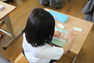 算数科では、「かずとすうじ」の学習をしています。この日は、10までの数の読み方・かき方・数の系列・大小を理解するために、具体物や数図ブロックを使って学習しました。机上の整理をして、数図ブロックを操作したり、手を挙げて発表したりする1年生の姿がとてもクールでした。