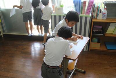 学期末に学校で行うことの一つにテストがあります。この日はひらがなのテストがありました。問題の絵を見て、それに当てはまるものの名前などをマスに書きました。一画一画丁寧に書くことができた1年生です。