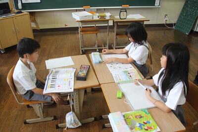 音楽科では、見つけた音を選んだりつないだりして音楽づくりの学習を始めました。まず、音楽の学習の雰囲気づくりのために「かごめかごめ」をしました。そのあと、身の回りの音集めをしました。学習シートに集めた音を書き込み、3人組でその音について出し合いました。この中から音を選んだりつないだりして、音楽作りを行います。