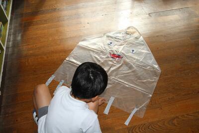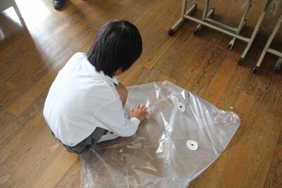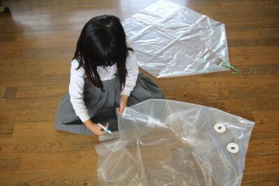 図工科では、「ひらひらゆれて」という学習を行いました。ハンガーにビニル袋を下げて、風に揺れる様子から自分が想像したものを作る活動を行いました。ビニル袋をはさみで切ったり、飾り付けをしたりなど、表したいものの形や色を工夫して作品を作りました。