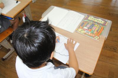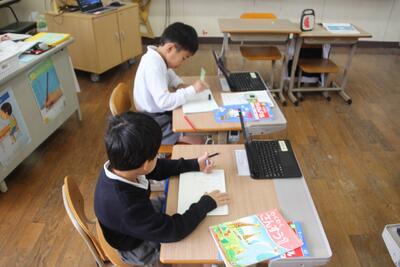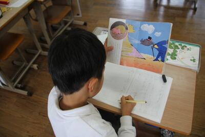 国語科では、昔話を読む学習をしています。昔話「おかゆのおなべ」を読み、お話の好きなところや面白かったところをカードにまとめました。この日は、自分で選んだ昔話を読み、「おかゆのおなべ」で学んだことを生かして、カードにまとめました。自分が選んだ昔話なので、一段とやる気がみなぎる1年生です。