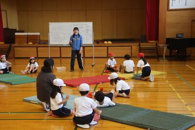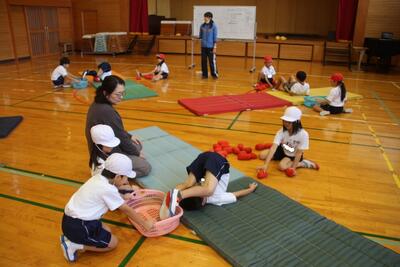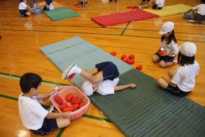 体育科では、マット運動遊びを学習しています。この日は、後ろ回りの基礎感覚づくりとして、玉入れの球を両足ではさみ、体を折り曲げながら頭の近くにあるかごに入れる活動を行いました。後ろ回りで勢いをつけるためには、両足の使い方がポイントの一つになります。1年生は友達と協力して、ゲーム感覚で動きを身に付けました。