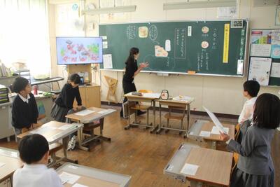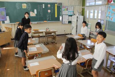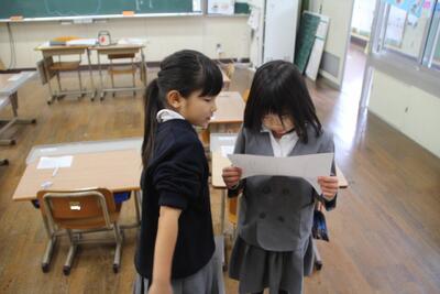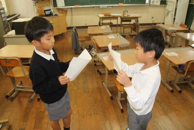 特別の教科道徳では、「さるとかに」という教材を使って、勇気・なかまとの連帯について考えました。この教材の中に、おもしろ半分で石を投げるさるに向かって、「やめてくれ」と、かにたちが団結して怒る場面があります。ここでのかにたちの思いを考え、ペアや全体でその考えを共有しました。不当な扱いに対して、みんなで力を合わせて訴えていく勇気を学びました。