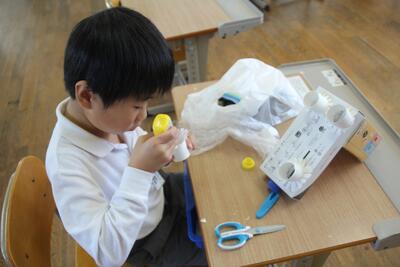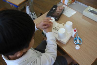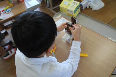 図工科では、箱を積んだり並べたりつなげたりする活動を楽しみながらあらわしたいものを見つけ、形や色を工夫して立体を作る学習をしています。家庭でいろいろな空き箱を準備していました。筒状のものを平面につけるために、接着部分を切り開いて上手につけていました。どんな作品ができあがるのか楽しみです。