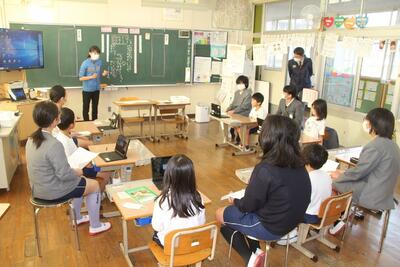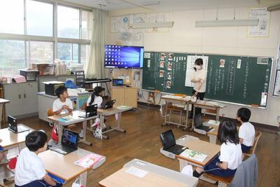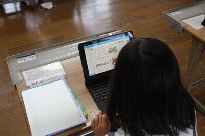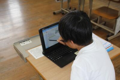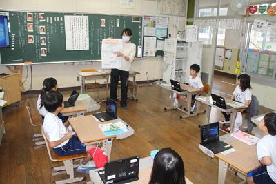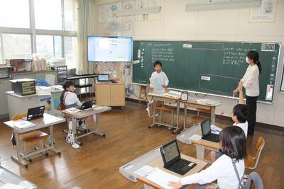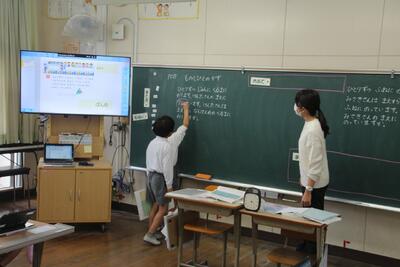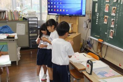 算数科では、ものとひとのかずという学習をしています。この学習では、絵や図を用いて別のものに置き換えたり並んでいる数から順番を考えたりする活動です。タブレットPCにある学習シートに自分の考えを書き込んで、みんなの考えを共有しました。学習リーダーを中心に学習を進めています。
