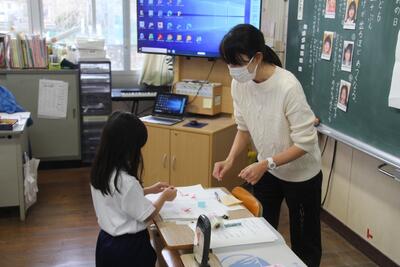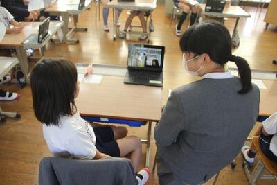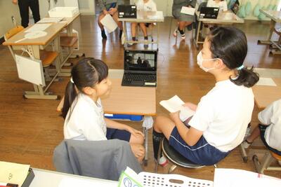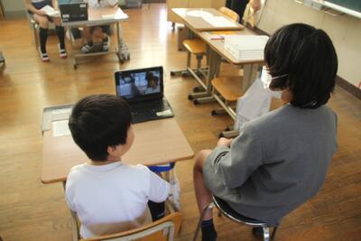 国語科では、話す・聞く「ともだちのこと、しらせよう」という学習をしています。来年度6年生になる5年生のことを新1年生に知らせるという単元のゴールを設定して、学習を進めています。この日は、5年生にインタビューをしました。「今、一番楽しいことは何ですか」という質問から、5年生のことを引き出していきました。インタビュー名人になった1年生です。
