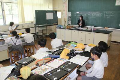 社会科では、まちの様子について学習しています。この日は、学校から南に広がるまちの様子について調べました。方位磁針を使って北の方角を確認しました。学校の南側には東陽町の中心部で、東陽支所やJA東陽支所・郵便局などがあり、みんなの暮らしを支えている施設などが多くあります。