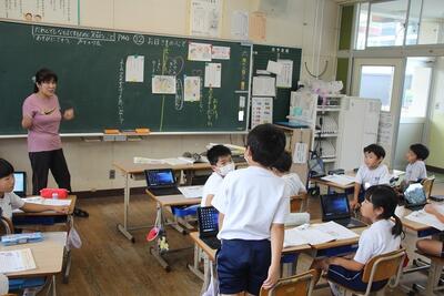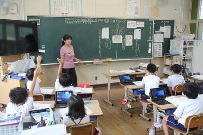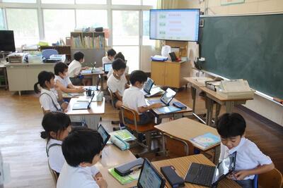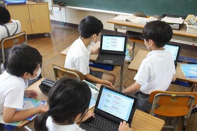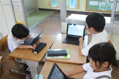 算数科では、一億までの数の仕組み・よみ方・かき方を理解し、十進位取り記数法のよさについて学習しています。この日は、都道府県の人口を比べていました。自分の考えをタブレットPCに入力し、その画面を見せながらグループで話し合いました。タブレットPCでは、拡大や縮小が簡単にできるので、説明を聞く側は分かりやすいです。