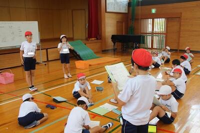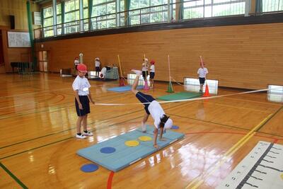 体育科では、マット運動に取り組んでいます。前転・後転・倒立系の運動を行い、この日は側方倒立回転を学習しました。逆さ感覚や腕支持の動きづくりを身に付けるために、壁登り倒立やとびばこを使った運動を行いました。腕や足が伸びた側方倒立回転になるように、ゴム紐を使って高さを意識した動きを考えました。授業の終わりでは、学習リーダーが進行役となって、自分や友達のよかったことを伝え合いました。みんなで上手になっている3年生です。