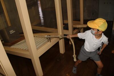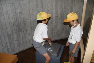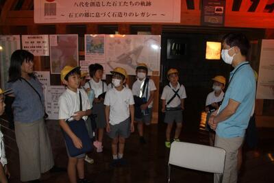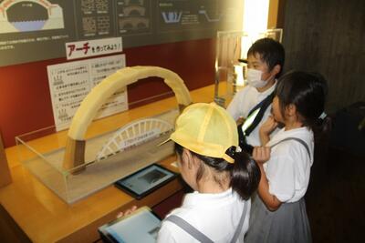 総合的な学習の時間では、本校から約400mの場所にある石匠館の見学に行きました。初めて訪れる子どもたちが多く、ワクワクしていました。展示物や説明動画を見たり、館長様の話を聞いたりしました。子どもたちが特に気に入ったのは、石材運搬の工夫について体験できるコーナーでした。20㎏の石を小さい力で持ち上げる工夫に驚いていました。種山石工集団のすごさを実感し、ますます東陽町が好きになった3年生です。見学したこの日に「通潤橋が国宝に指定される」というニュースが流れ、種山石工集団の活躍を展示したこの石匠館の評価もさらに高くなりそうです。