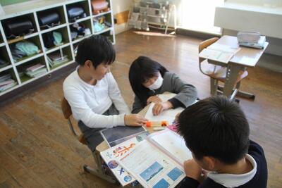 理科では、冬の星について学習をしています。この日は、観察したオリオン座の位置や並び方について、観察結果をもとにグループでまとめる学習を行いました。オリオン座は、一日の内でも時刻によって位置が変わるが、並び方は変わらないことを確認しました。