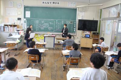 算数科では、小数のかけ算とわり算の学習をしています。この日は、小数倍について考えました。既習事項の「図を使って考えよう」をもとに、関係図をかいて問題を解くよさについて話し合いました。もとにする量とくらべる量を関係図にまとめ、何倍になるのかを求めることができました。