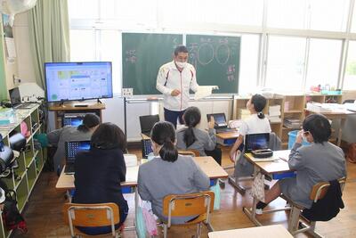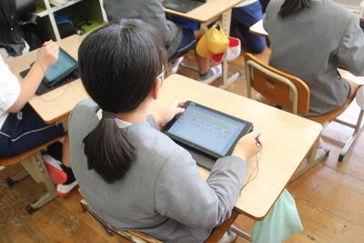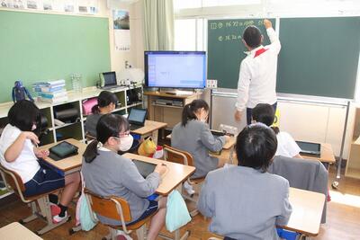 算数科では、整数と小数の学習に入りました。整数や小数の小数点の移動の仕方を考えることを通して、十進数の仕組みや表し方を理解し、学習や生活の中に生かしていきます。この日は、タブレットPCを使って答えを入力し、みんなでそれを確かました。タブレットPCの使い方に慣れてきた5年生です。