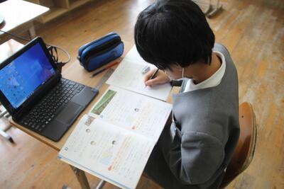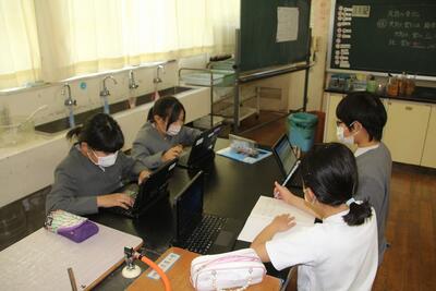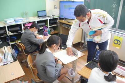 理科では天気の変化について学習しています。この日は天気がよすぎて、雲が少なく観察するには条件がよくありませんでした。雲の量や動きをタブレットPCで撮影して、観察記録にまとめました。画像データがあるのでとても便利です。