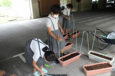 理科では、2学期に学習する「植物の実や種子のでき方」のために、アサガオの種まきをしました。一人1鉢のプランターに土を入れて種をまき支柱を立てました。夏休み期間も大切に育てて、2学期の学習に備えます。